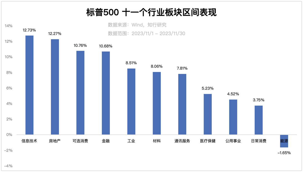 具体股票方面,标普500 十一个行业板块中,有十个出现上涨,涨得最好的是信息技术和房地产,涨幅均在 12% 以上;能源板块出现下跌,跌幅为 1.65%。具体指数表现中,11 月份标普500、标普500等权和纳斯达克100指数都出现了较大程度的上涨,涨幅分别为 8.91%、8.87% 和 10.67%。