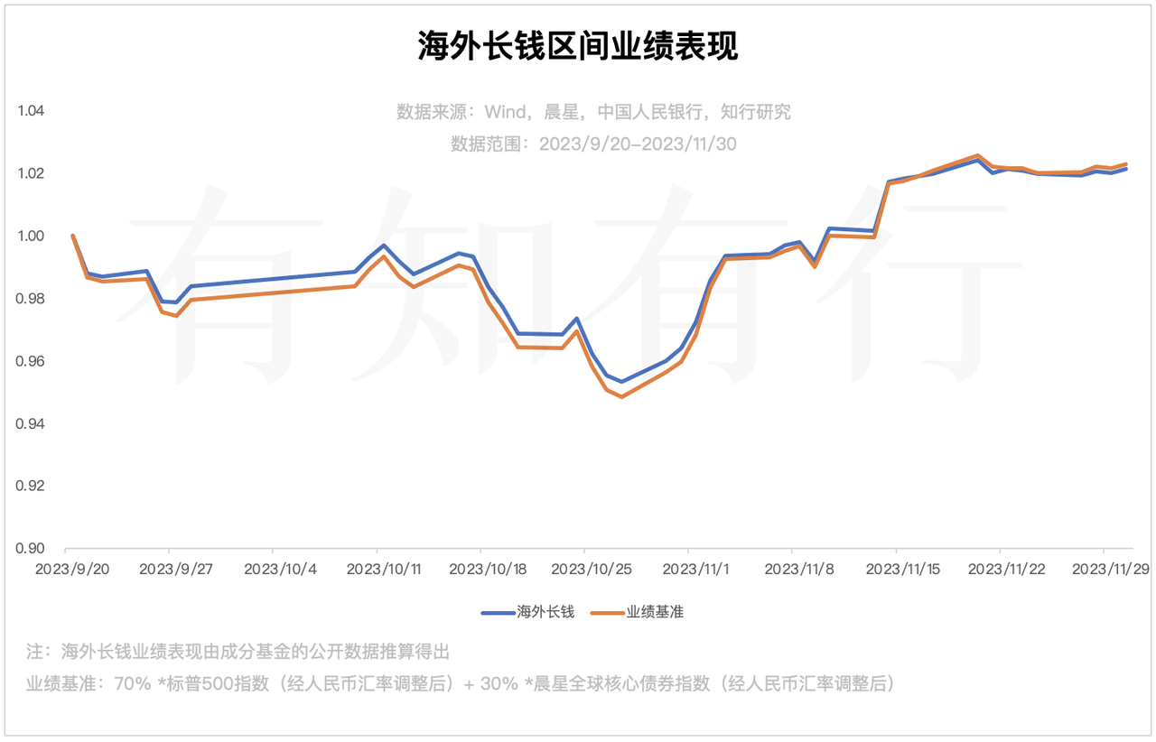 海外长钱 11 月单月上涨 5.96%,其中股票部分相对业绩基准略有超额,债券部分相对晨星全球核心债券指数略有落后。自 2023 年 9 月 20 日上线至 11 月底,总回报为 2.14%。