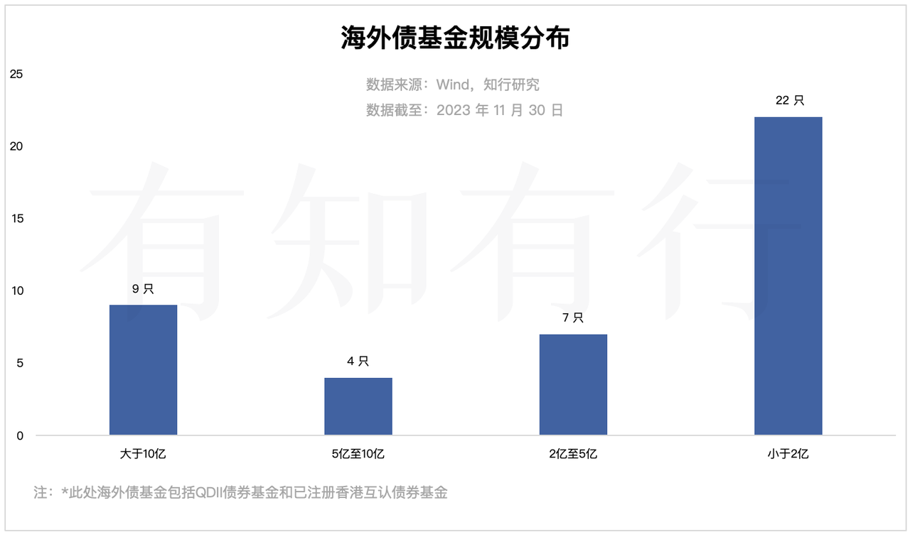 截至 2023 年 11 月 30 日,市场上共有 25 只 QDII 债券型基金,总规模约 112 亿元。QDII 基金总规模约为 3900 亿元,债券型基金只占 QDII 基金总规模的 3% 不到。