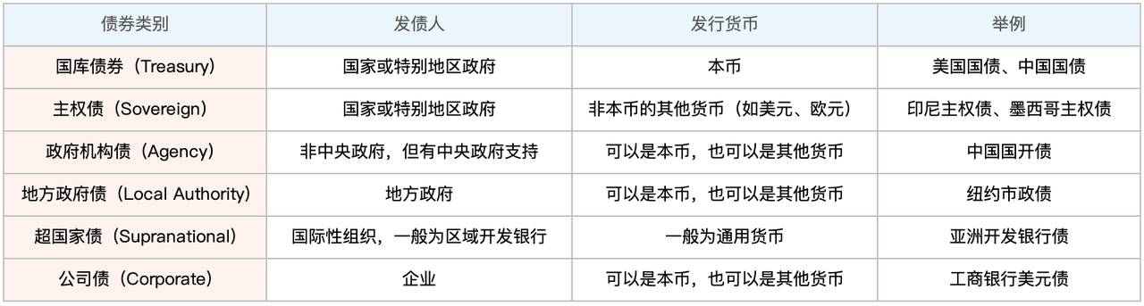 海外债是一个范围极广的分类,理论上来说,海外债基金的投资范围包括境内境外的大部分债券。按发债主体和发行货币来分类,我们大致可以把债券分为以下几类(较复杂的资产抵押类债券先不纳入图表)。