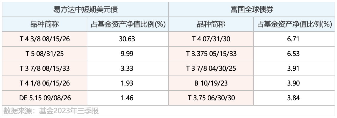 接下来看一下它们的持仓,根据三季报披露的数据,海外长钱内的 QDII 债券基金的前五大持仓如下图所示: