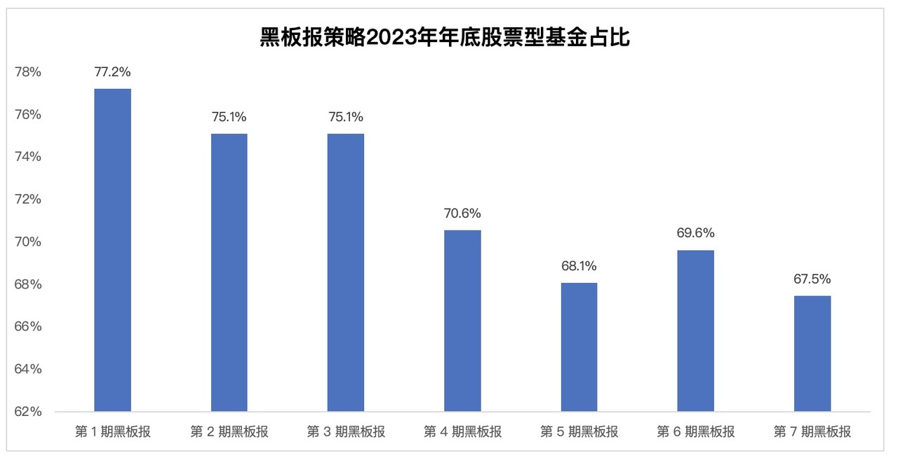 在过去市场整体重心不断下移的背景之下,黑板报策略坚持在市场的下跌过程中,秉持着越跌越买、逆向投资的策略,逐渐把每一期黑板报策略的股票类资产仓位提高至适宜的水平。以下是截止到 2023 年年底,第 1-7 期黑板报的股票类资产的具体仓位情况。