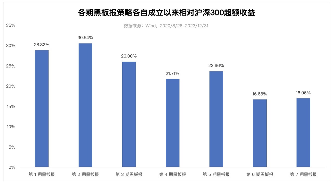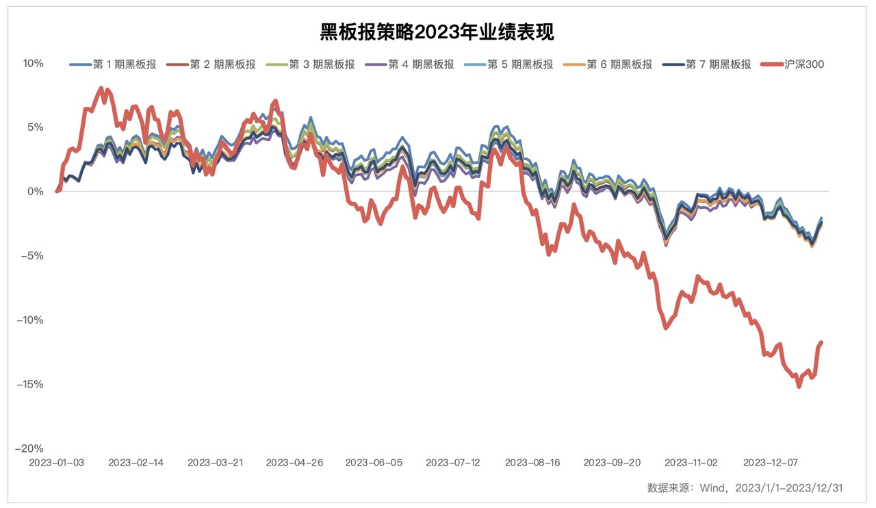 7 期黑板报策略 2023 年全年的收益率在 -2.0% 到 -2.6% 之间,最大回撤在 8% 到 9% 区间,同期沪深300下跌 11.4%,最大回撤达到 21.5%。黑板报组合在熊市之中控制了组合下跌的幅度,贡献了一定的超额收益表现。