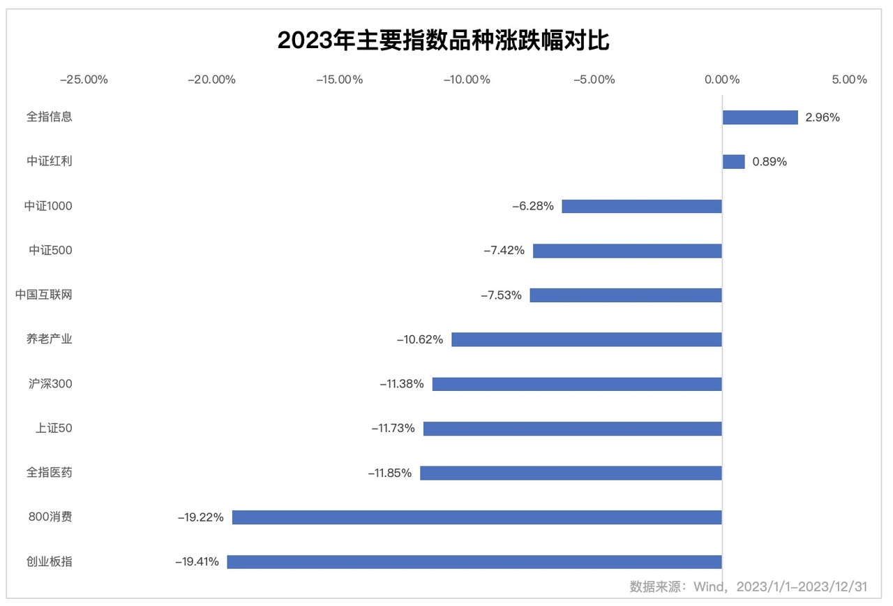 2023 年主要指数品种的涨跌幅对比,显示出明显的「哑铃型」特征:一头是以股息分红为主要收益来源、未来预期业绩增速平缓的中证红利指数,另一头是当期股息分红较少、未来预期业绩增速较快的全指信息指数。两者是唯二在 2023 年获得正收益的主要指数品种,也反映出过去的一年市场整体情绪的极端,要么选择现实的红利,要么拥抱梦想的科技,而处于中间的品种却不断受到估值和业绩的双双承压。