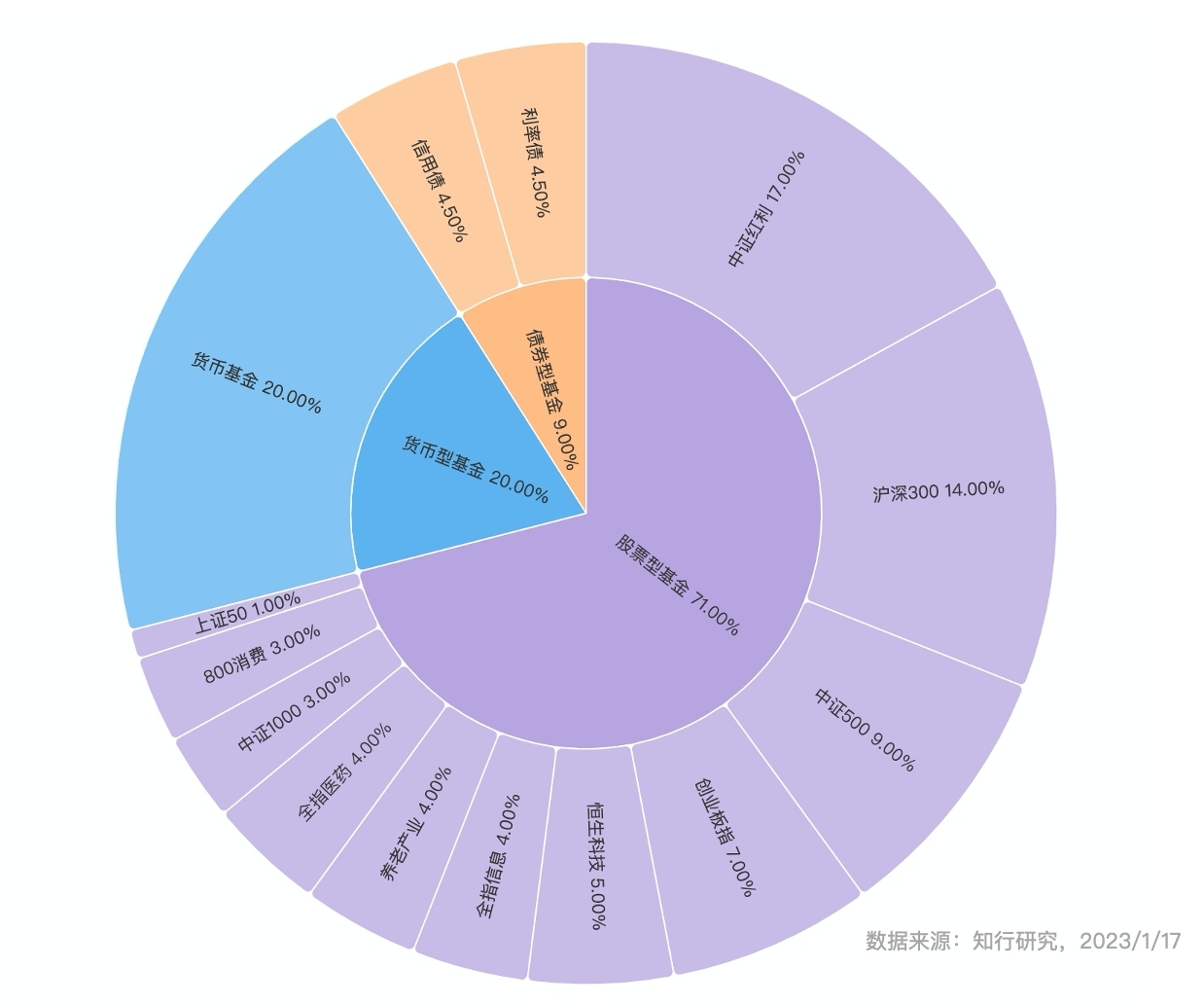 如果你在当下有一笔新钱要买入长钱账户,长钱账户会按照下图所展示的基金品种情况,将你的投入资金进行合理的分配。其中股票型基金占比 71%,涉及多个指数品种,以宽基指数为主,行业主题指数为辅,分散配置。在债券基金上,分散配置了利率债基金和信用债基金。货币基金除了起到大类资产分散配置的作用之外,还承担了日后加仓的备用金的作用。