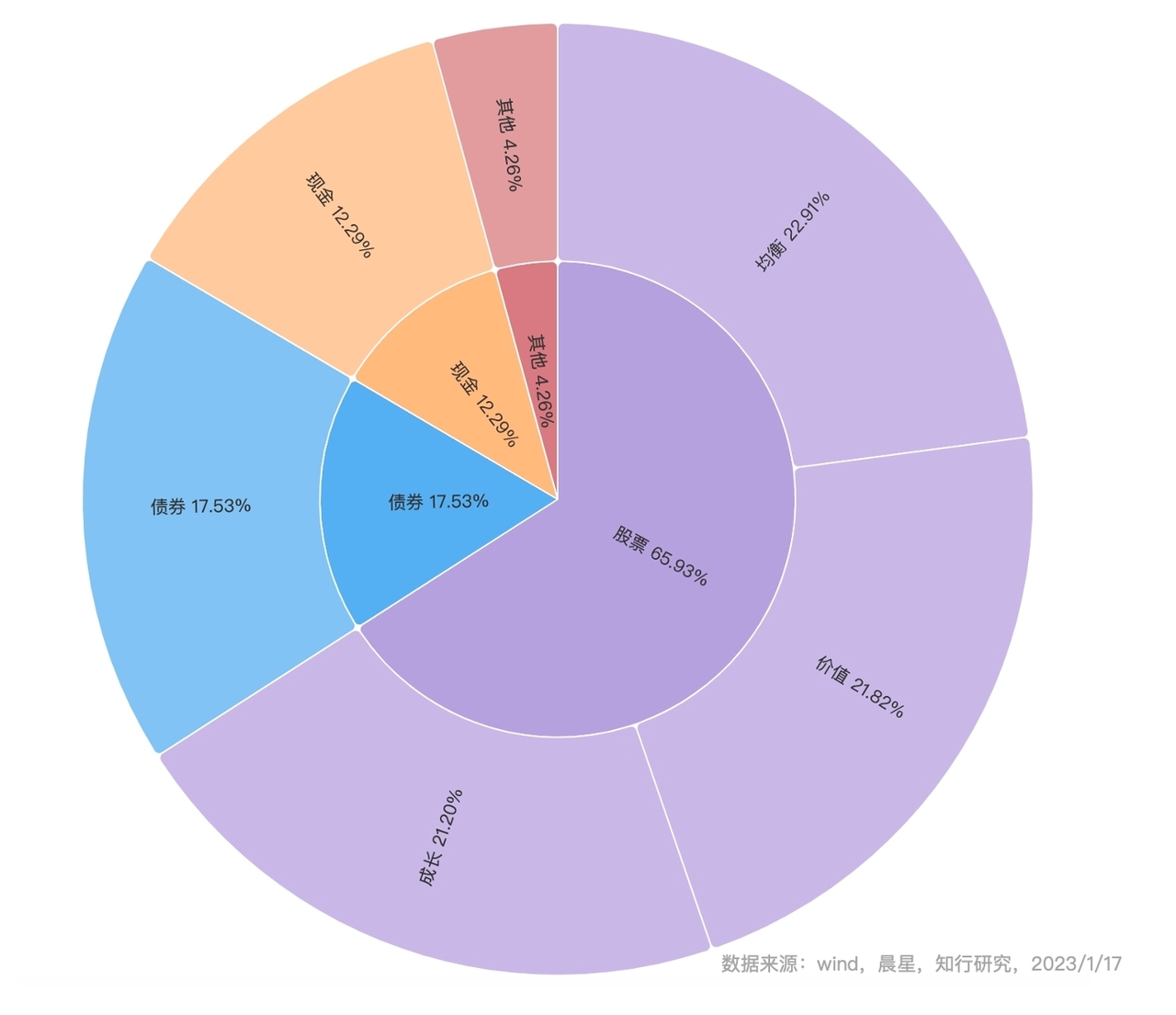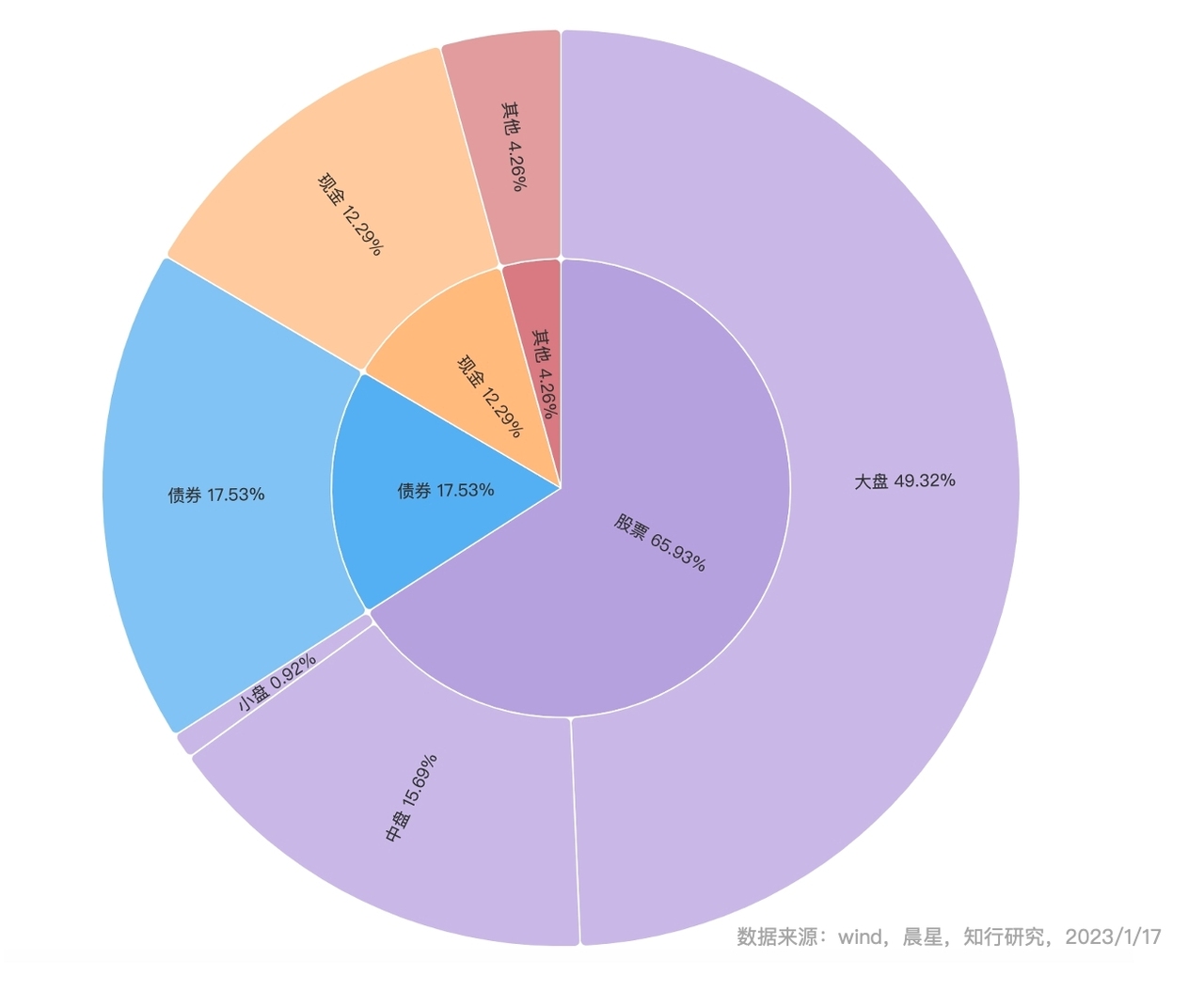 如果透过基金的维度,去看底层资产的股票、债券、现金等资产的配置情况,可以参考下面两张图。由于基金本身不满仓,所以长钱账户穿透到底层资产后,股票仓位只有 65.93%,除此之外,债券仓位是 17.53%,现金及其他仓位在 16.54%。如果把股票部分再进行拆分,会看到长钱账户以大盘股为主,中小盘股为辅,价值、成长、均衡分散配置。这也是长钱账户一直以来保持的风格。
