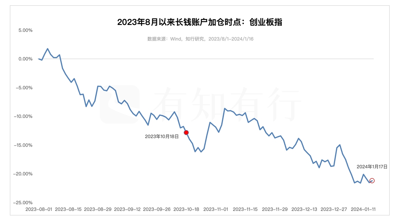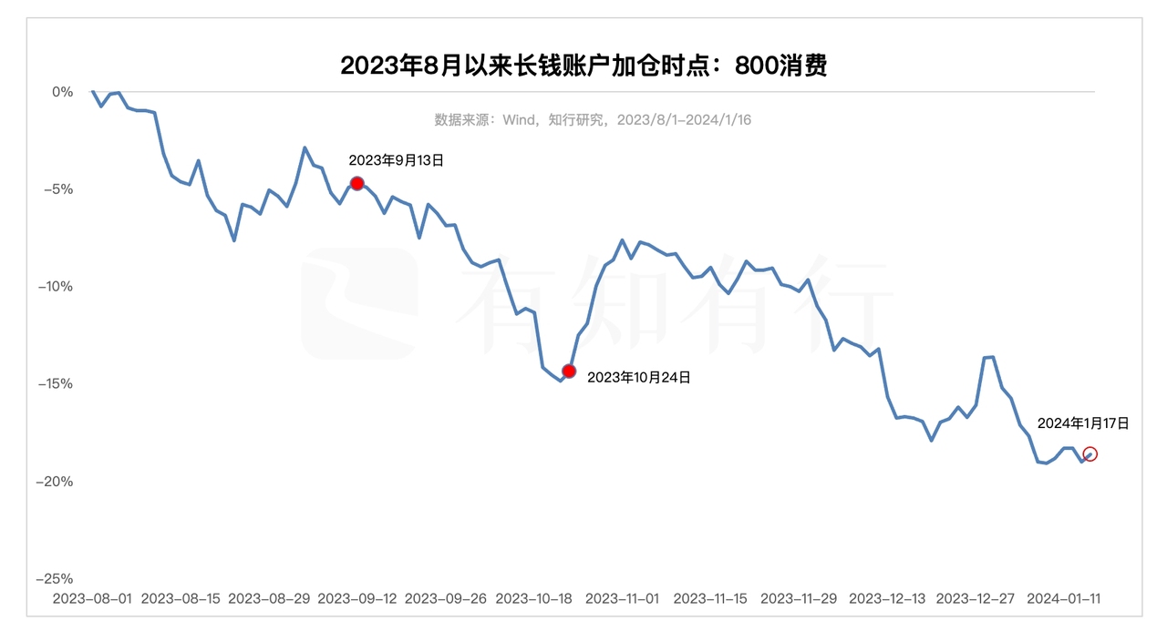 上面两张图展示了去年 8 月 1 日以来,长钱账户对于800消费和创业板指的加仓情况。从加仓时点上来看,做了时间上的间隔,例如创业板指上次加仓还是在 2023 年 10 月 18 日,距离现在已经有三个月的时间。同时,从加仓时点对应的指数的业绩表现来看,长钱账户也做了空间上的考虑,随着指数下跌幅度的增大,来慢慢买入,摊低成本。