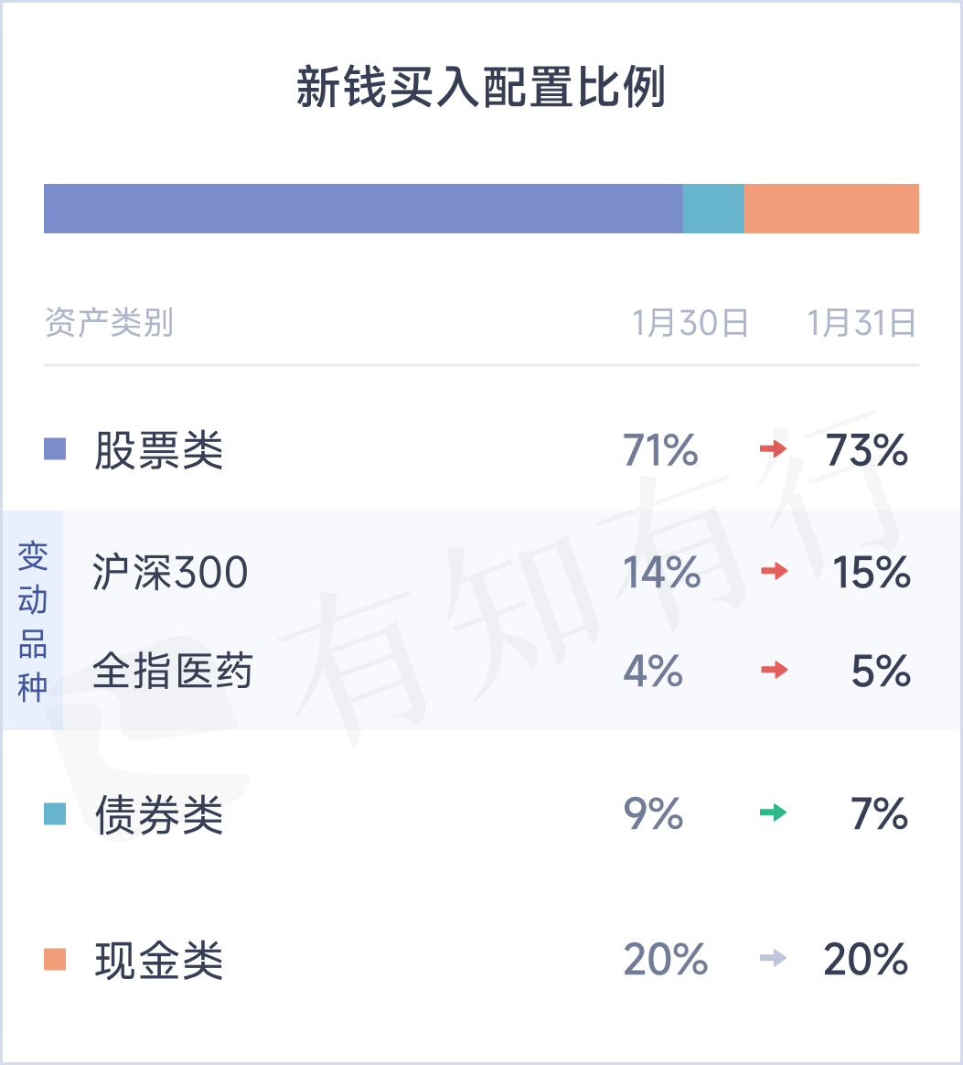 我们来看看长钱账户面对这种局面,是怎么选择的。本周长钱账户调整了「新钱买入配置比例」,将股票类资产的比例从 71% 提高到了 73%,增加的仓位分别给了沪深300和全指医药。
