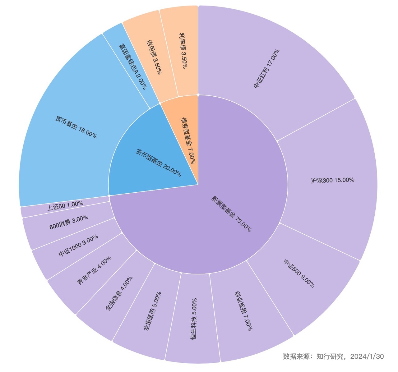 如果你在当下有一笔新钱要买入长钱账户,长钱账户会按照下图所展示的基金品种情况,将你的投入资金进行合理的分配。其中股票型基金占比 73%,涉及多个指数品种,以宽基指数为主,行业主题指数为辅,分散配置。在债券基金上,分散配置了利率债基金和信用债基金。货币基金除了起到大类资产分散配置的作用之外,还承担了日后加仓的备用金的作用。