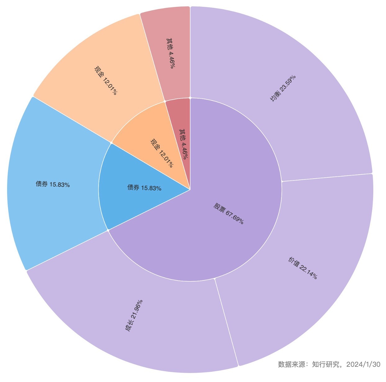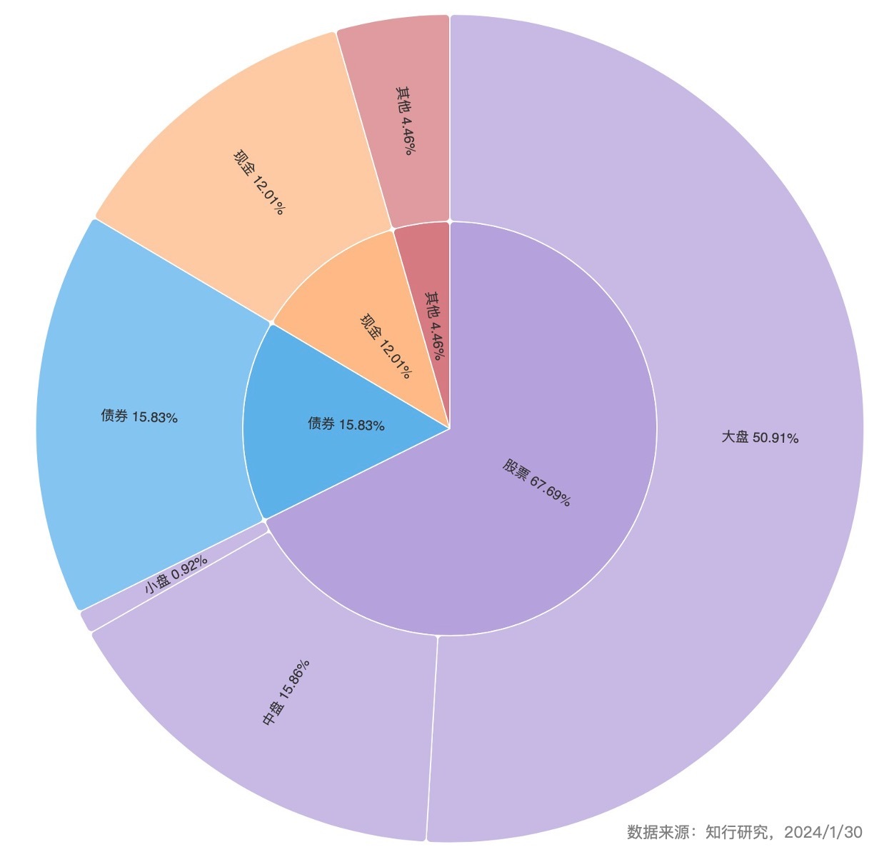 如果透过基金的维度,去看底层资产的股票、债券、现金等资产的配置情况,可以参考下面两张图。由于基金本身不满仓,所以长钱账户穿透到底层资产后,股票仓位只有 67.69%,除此之外,债券仓位是 15.83%,现金及其他仓位在 16.48%。如果把股票部分再进行拆分,会看到长钱账户以大盘股为主,中小盘股为辅,价值、成长、均衡分散配置。这也是长钱账户一直以来保持的风格。