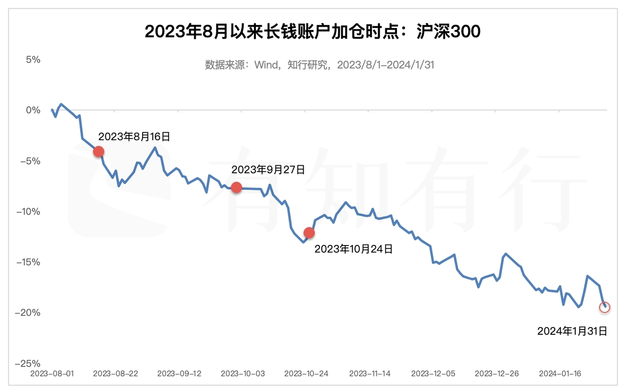 在既定的投资框架和投资体系内,长钱账户就像一个没有感情的投资机器,按照自己的投资纪律,排除个人投资情绪的干扰,在做它投资认知里该做的事情。在今年下跌的市场里,长钱账户做了两次加仓操作,上次是 1 月 17 日,长钱账户加仓了创业板指和800消费,这次加仓了沪深300和全指医药。