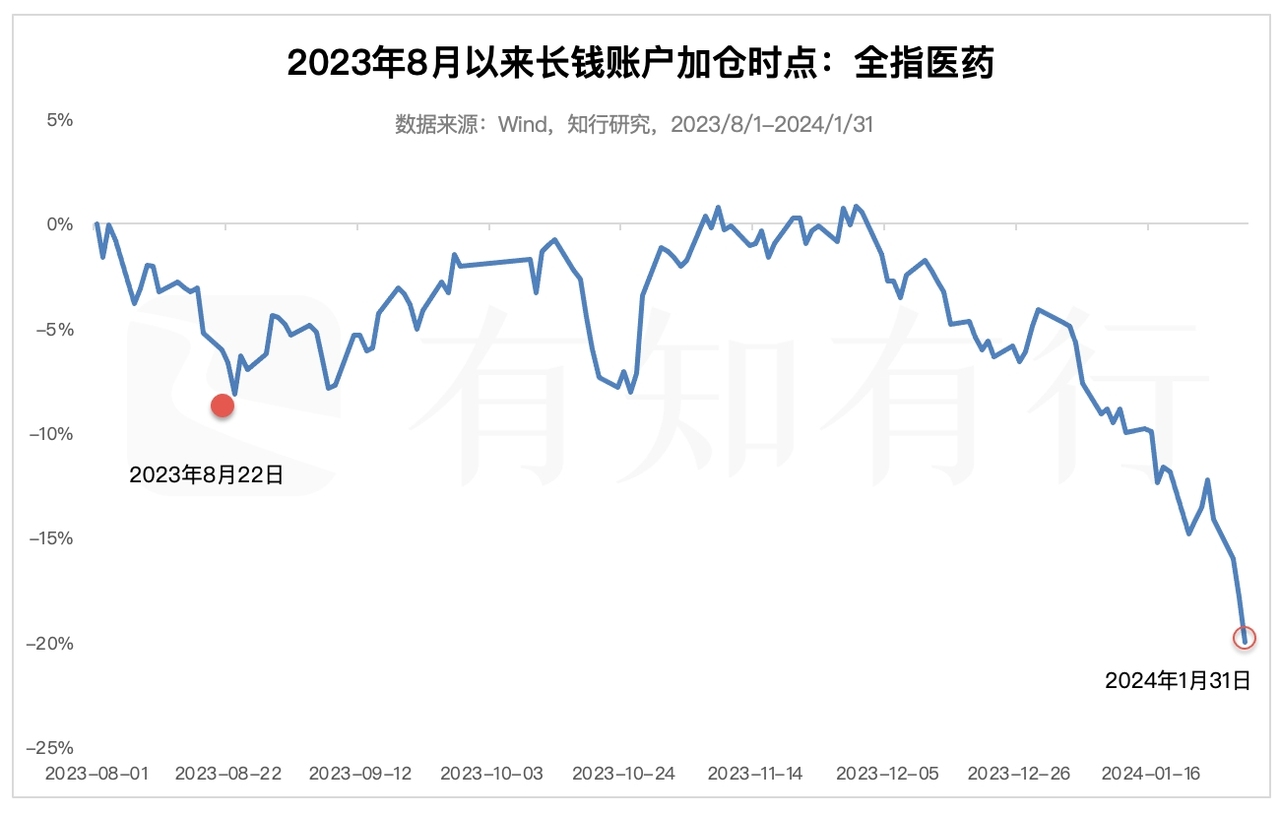 上面两张图展示了去年 8 月 1 日以来,长钱账户对于沪深300和全指医药的加仓情况。沪深300上次加仓还是在 2023 年 10 月 24 日,距离现在已经过去了三个月,期间沪深300下跌了 7% 左右。全指医药上次加仓是 2023 年 8 月 22 日,距离现在已经过去了五个月,期间全指医药下跌了 12% 左右。考虑了时间和空间之后,叠加市场不断下跌的趋势,可以很好地起到摊低成本的目的。