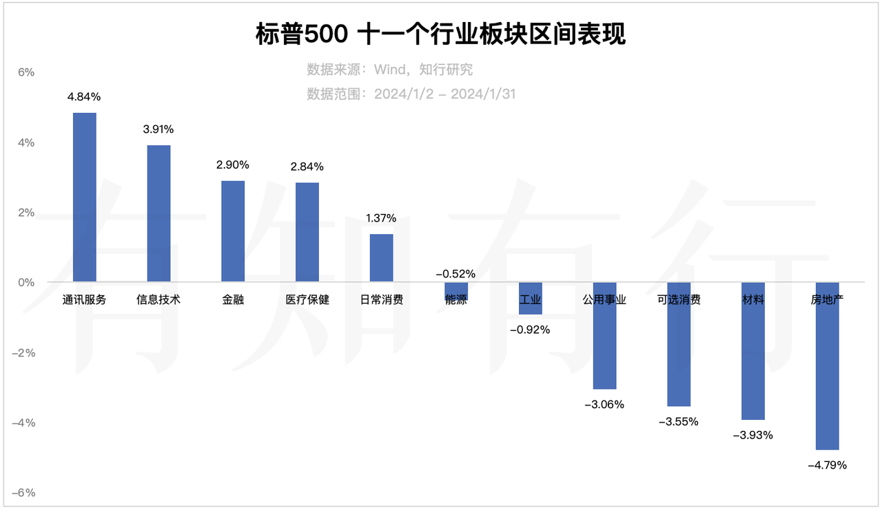 我们的过节气氛还没开始浓烈,但美国市场已经从圣诞和新年的节日氛围中调整了过来。先来看一下 2024 年第一个月美国市场的表现。