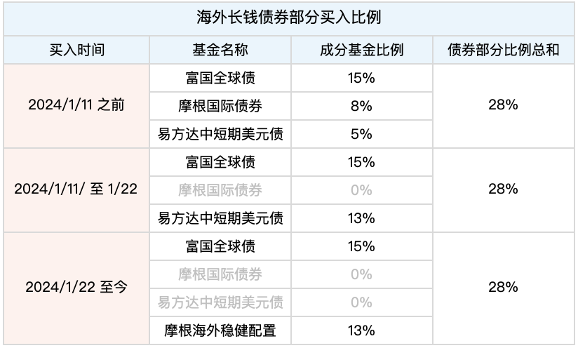 接下来,我们回顾一下海外长钱在一月份进行的两次调整。这两次调整都是因为成分基金暂停申购,所以对于不同时间段买入海外长钱的用户来说,你们所买入的海外长钱债券持仓会略有差别。