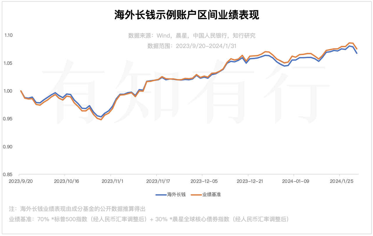 为此,我们也对海外长钱的业绩推算方式进行了一些调整。我们通过研究分析海外长钱成分基金的表现测算出它的区间业绩,示例账户的业绩展示了这两次的调整,目的是为了跟当下用户能买入的资产一致。而实际用户的收益会有区别,因为大家的海外债券基金略有差异。按这种方式计算后,海外长钱示例账户一月份单月上涨 0.82%,自 2023 年 9 月 20 日上线以来,共上涨 6.78%。