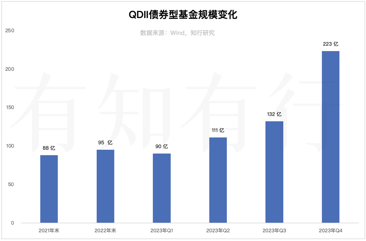 或许是近期A股表现不佳,投资者展现出了对海外投资的兴趣。跨境 ETF 的火热自不用提,QDII债券型基金的规模也发生了较大增长。下图为自 2021 年年末以来,QDII债券型基金的规模变化。可以发现,2023 年四季度的总规模,相较于三季度增长了 90 亿左右。原本海外债基金就不是一个大众的投资品种,此次增加的规模几乎相当于之前整个品种的规模量。