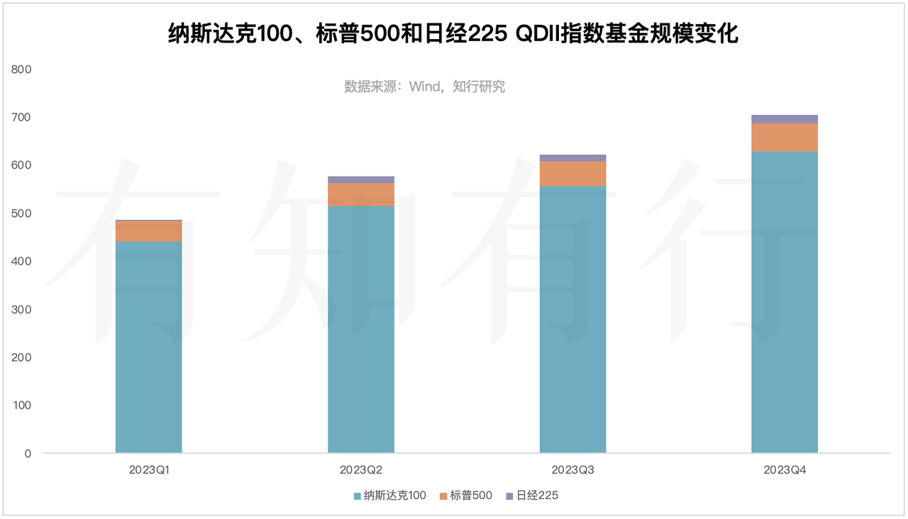 QDII 股指基金方面,我们可以看到纳斯达克100、标普500和日经225的规模都自 2023 年年初发生了增长。日经225指数ETF,从 2023 年第一季度的 2 亿,增长到了第四季度的 18 亿。