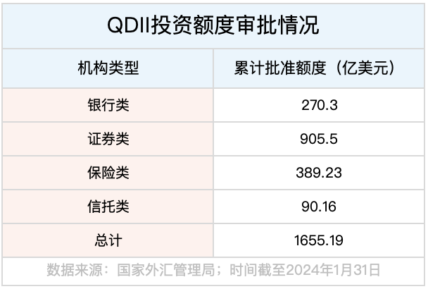 根据国家外汇管理局公布的《合格境内机构投资者(QDII)投资额度审批情况表》显示,截至 2024 年 1 月 31 日,国家累计批准 QDII 额度为 1655.19 亿美元。其中银行类 270.3 亿美元,证券类 905.5亿美元,保险类 389.23 亿美元,信托类 90.16 亿美元。我们所购买的公募基金属于证券类,所以总额度在 905.5 亿美元以内。
