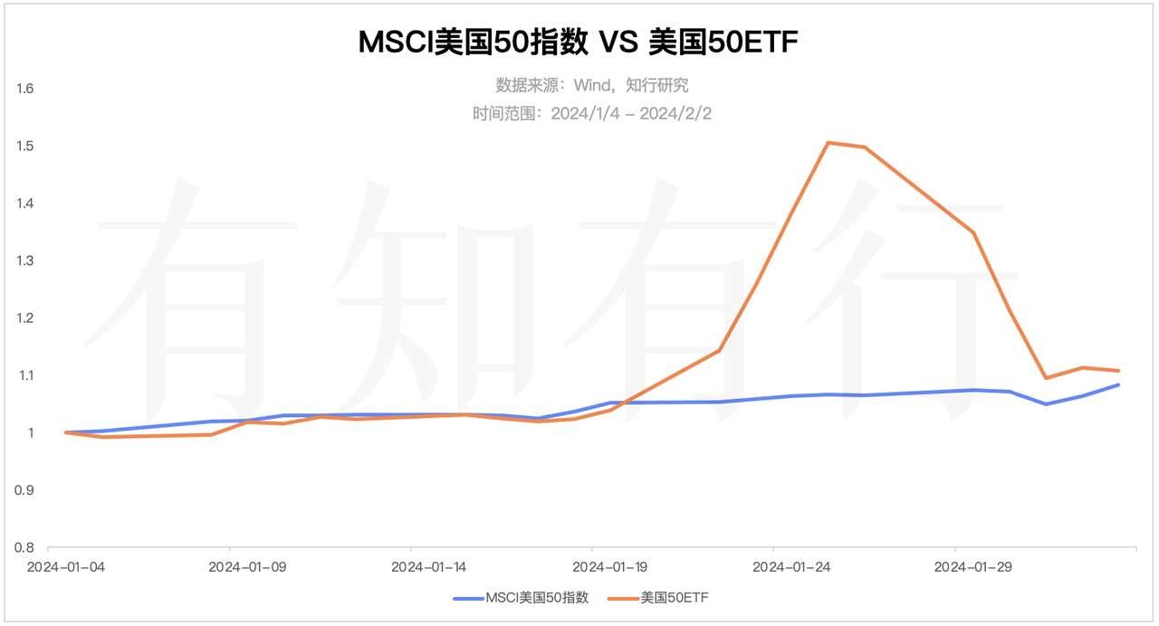 一个比较极端的案例,是美国50ETF近期的表现。美国50ETF跟踪的是MSCI美国50指数,下图为一月份以来指数与 ETF 的行情走势。可以发现该 ETF 自 1 月 22 日起大幅偏离指数的走势,1 月 25 日的溢价率甚至在 40% 以上。为了警示投资者溢价风险,基金公司多次发布了溢价风险提示公告且多次停牌。1 月 25 日至 1 月 31 日,MSCI美国50指数下跌了 1.6%,但美国50ETF却下跌了 27.3%。至此溢价率才下降,目前的溢价率仍在 5.7% 左右。
