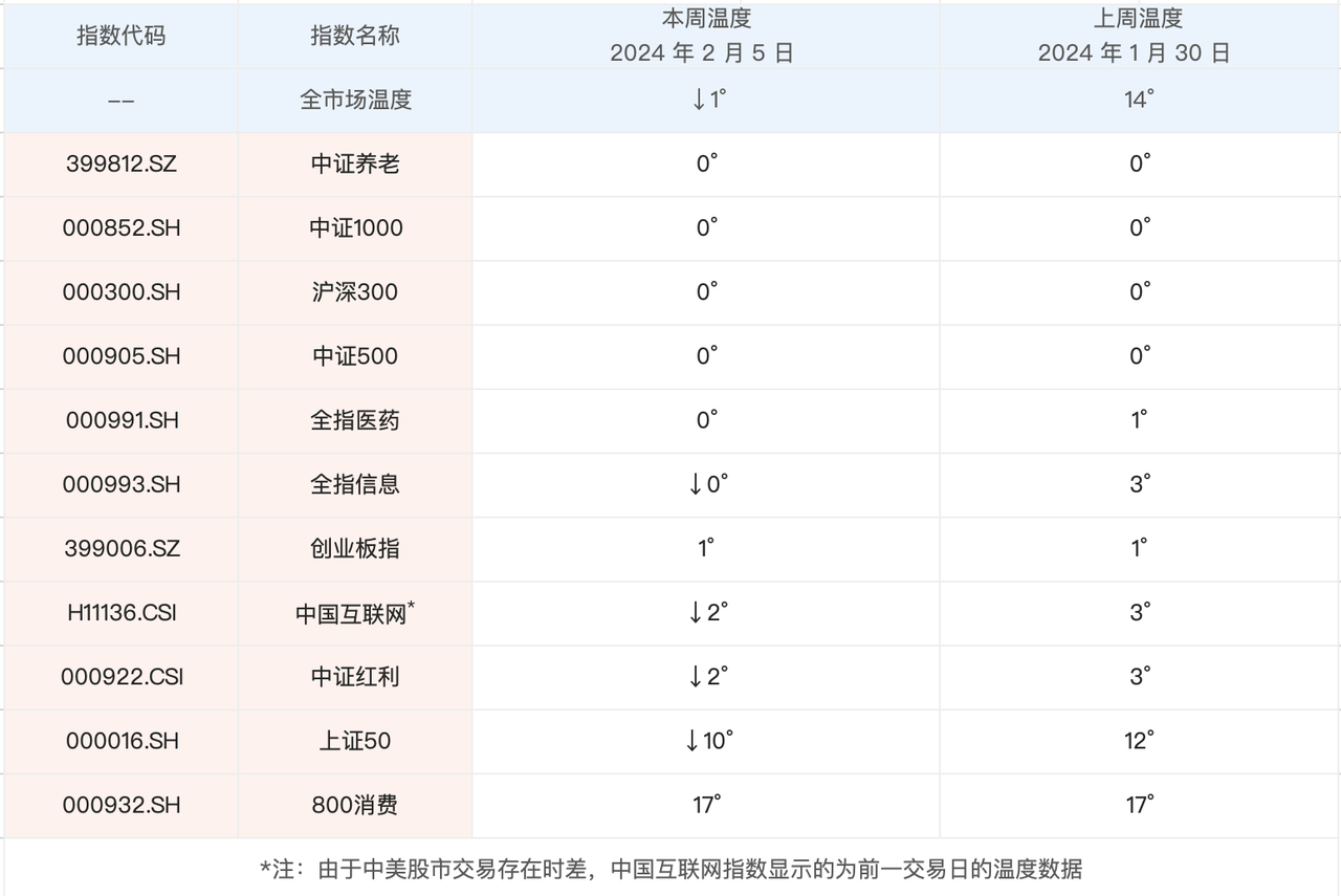 再来看一下具体指数温度,目前我们关注的指数里,除了上证50和800消费的温度还在 10° 以上,其他都在个位数,而且五个指数的温度是 0°。从具体指数的视角来看,目前也是它们各自的底部位置。