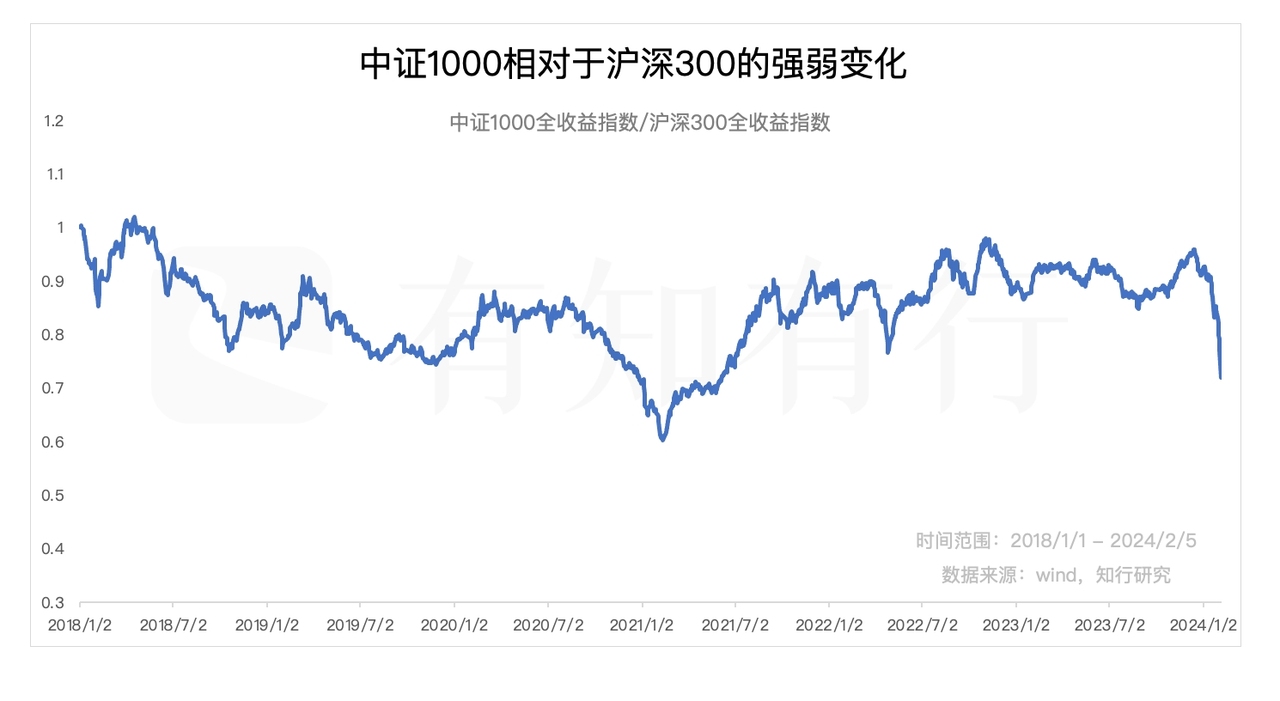 2018 年年初,两个指数的相对值是 1,之后从 2018 年一直到 2021 年 1 月份,整体来说,中证1000跑输了沪深300,背后代表了小盘股整体跑输了大盘股,拥抱核心资产成为潮流。2021 年之后一直到 2023 年,中证1000的表现开始好于沪深300,二者的相对值甚至回归到了 1 附近,背后代表了小盘股这三年跑赢了大盘股。然后今年开年,随着小盘股快速下跌,中证1000在三年积累的超额收益快速缩水。