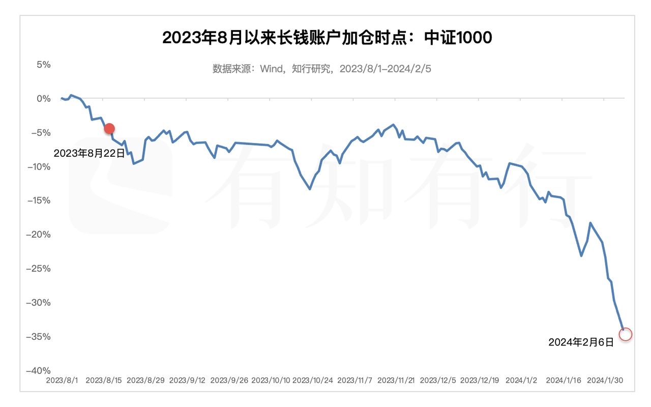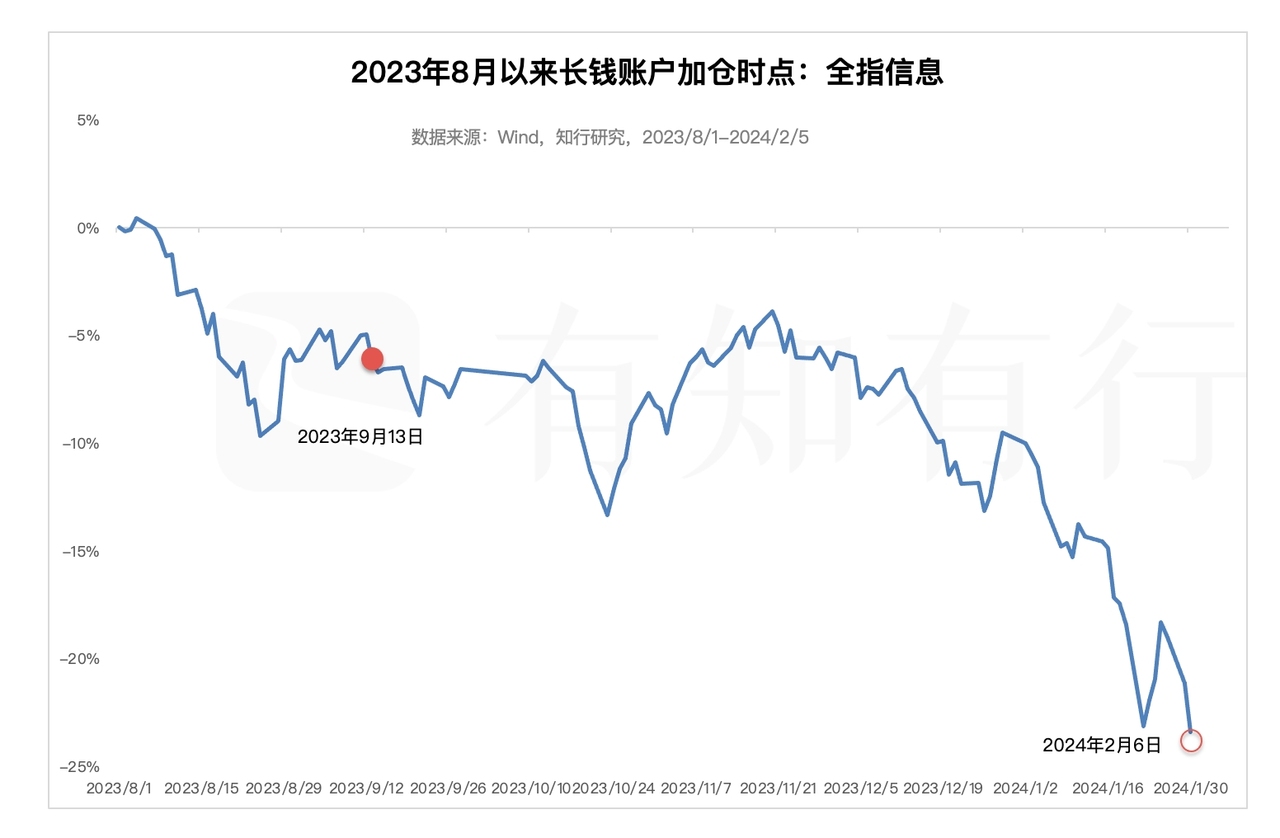 因此长钱账户选择在这个时候买入跌幅明显的中证1000,是很好理解的。其实全指信息也是如此。下面两张图展示了 2023 年 8 月以来,长钱账户在中证1000和全指信息上的加仓时点。上次加仓中证1000和全指信息,是在去年的 8 月、9 月,之后两个品种一直横盘震荡,直到今年,才开始快速下跌。这次长钱账户加仓它们,距离上次加仓时点,二者的跌幅都有 20% 以上。