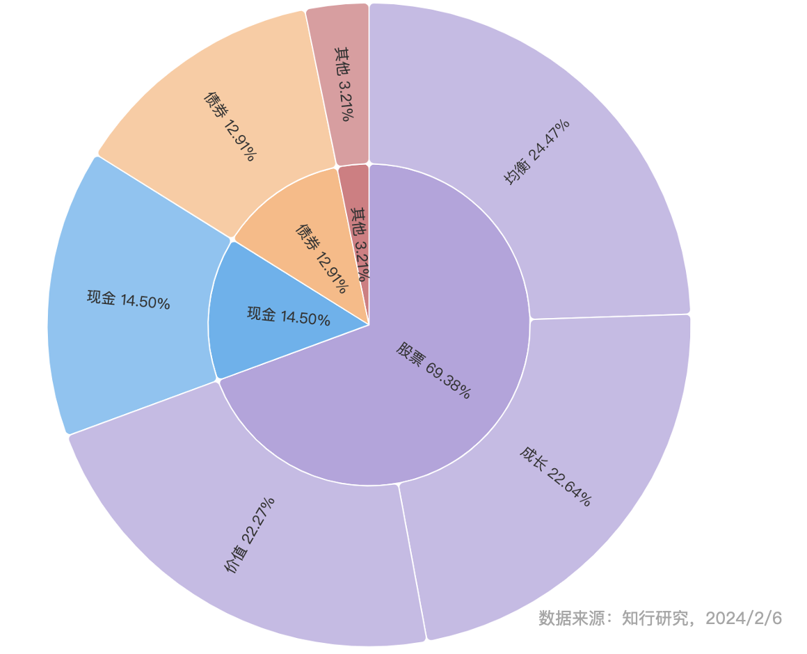 经过这次调整,长钱账户配置的股票类基金的比例达到了 75%,具体持仓以及穿透后的资产风格见下面三张图。长钱账户目前穿透资产后,最新的股票仓位是 69.38%,接近七成了。大部分用户持有的长钱账户,股票仓位在六成到七成之间。
