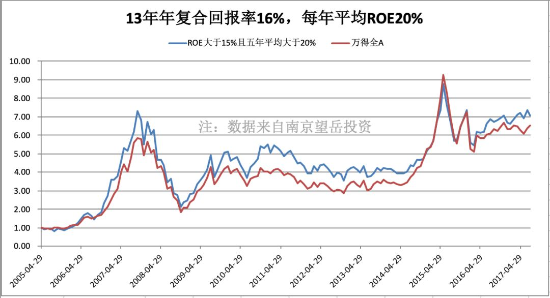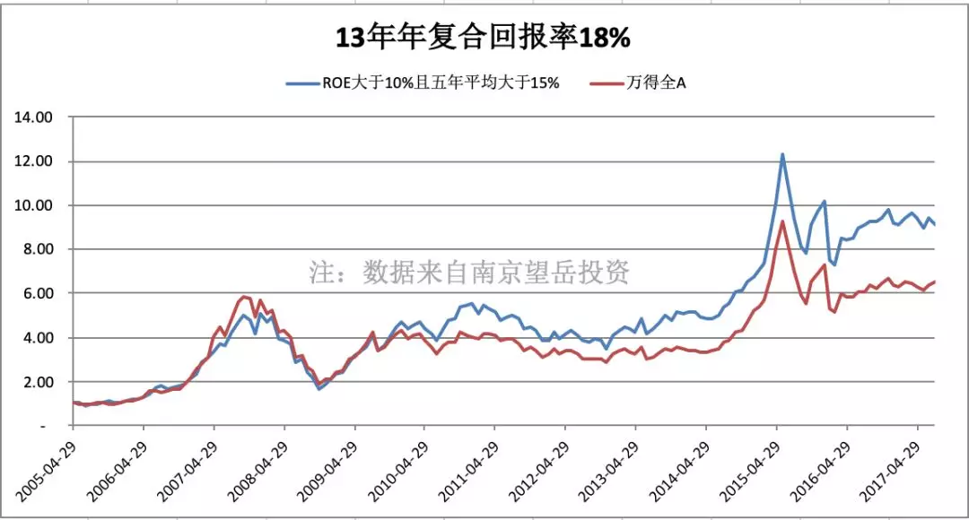 继续说实验,在中国 A 股,以「ROE 五年平均值大于 15% 且最低年份不低于 10%」为标准,选出一组股票进行持有,可以得到这样一个结果,从 2005~2017 年,该股票组合十三年年复合回报率 18%,基本与 15% 的 ROE 同步,并且超越同期市场平均——全 A 指数。