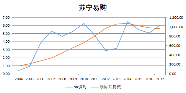 选苏宁是因为老妈的推荐,也不知道她是听谁的推荐,大概率是券商营业部的某个老师吧,但站在当时的视角来看,苏宁的业绩的确也是杠杠的,对吧,然而这些年 ROE 就下滑的比较厉害了。