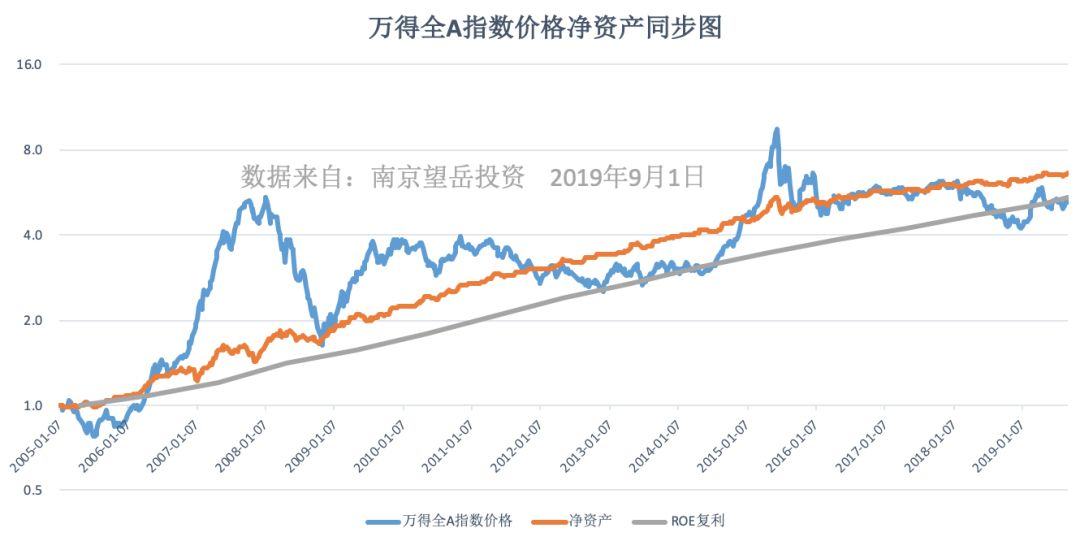 首先,把视野范围扩大至整个 A 股,采用万德全 A 指数,以 2005 年 1 月 7 日为始点,以 2019 年 6 月 30 日为终点,将指数价格,净资产进行归一化处理,同时计算年度 ROE 复利累计值,将他们画在一张图上。