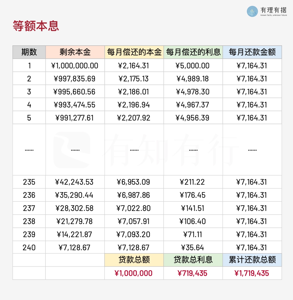 第一个月,小理欠银行 100 万,月利率为 6% / 12= 0.5%, 本月要还的利息为 100 万* 0.5% = 5000 元,本月要还的本金为 7164.31 - 5000= 2164.31 元。