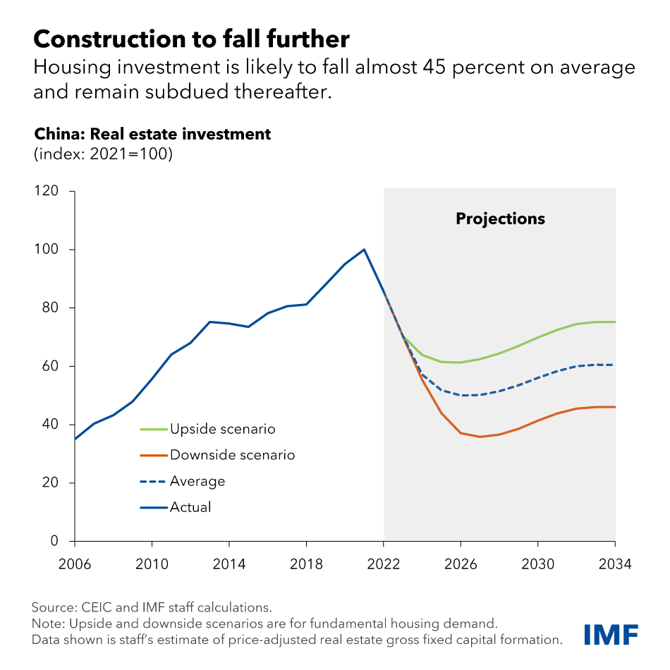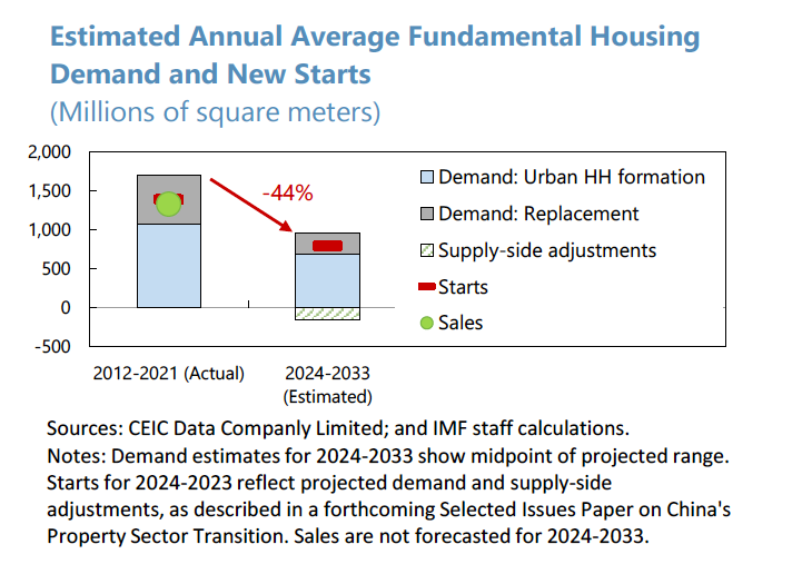 国际货币基金组织在 2023 年做了一份关于中国的最新研究报告,分析了中国的房地产。这也从一定角度证明了中国经济对全球的重要性。它们在这份研究中看到,如果与过去十年(2012-2021)做对比,中国城镇居民未来十年(2024-2033)的房地产需求大概减少了44%。