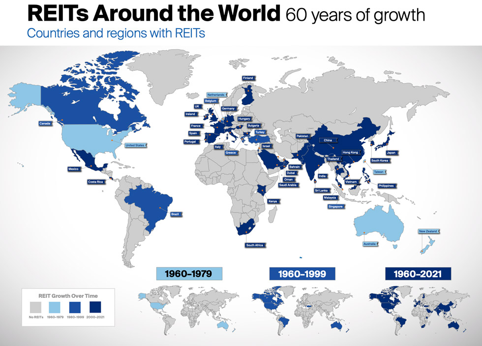 图中显示了 REITs 在全球的分布,颜色深浅代表了 REITs 在该地区出现的时间。Picture from Nareit