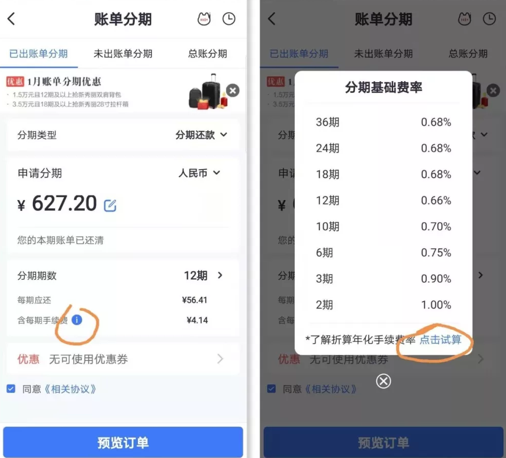 大部分银行分期的时候都有「点击试算」告诉你真实的年化利率是多少,但是很隐蔽,很多人不知道。