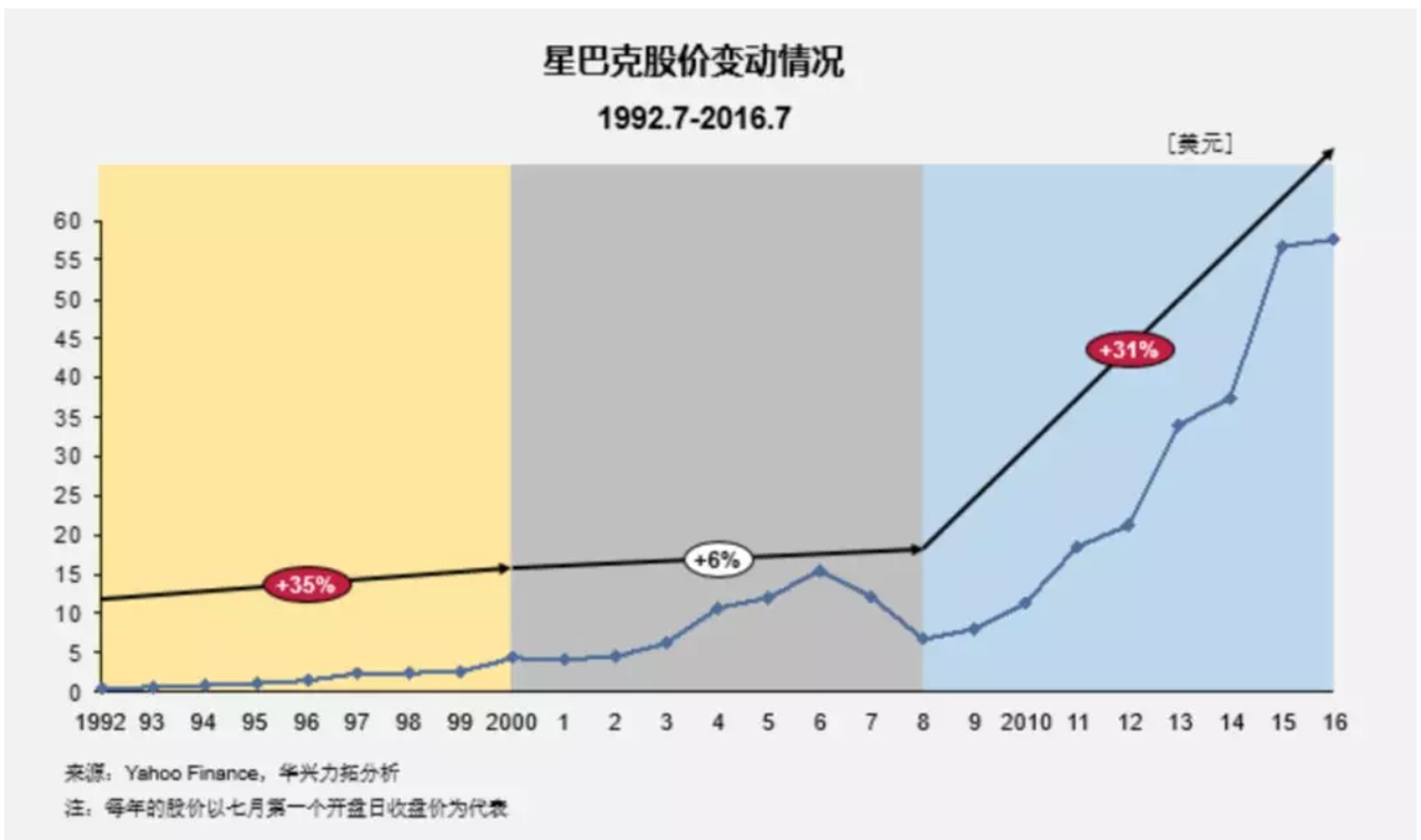 这张图是「华兴力拓」根据 Yahoo Finance 的数据做出的星巴克自 1992 年上市到 2016 年的股价走势图。