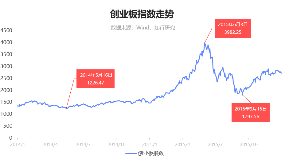 我们以创业板指数为例做了一张图。从图上你可以看到,创业板指数自 2014 年 5 月 16 日的 1226.47 点,在一年内涨到了 3982.25 点,然后又跌到了 1797.56 点。