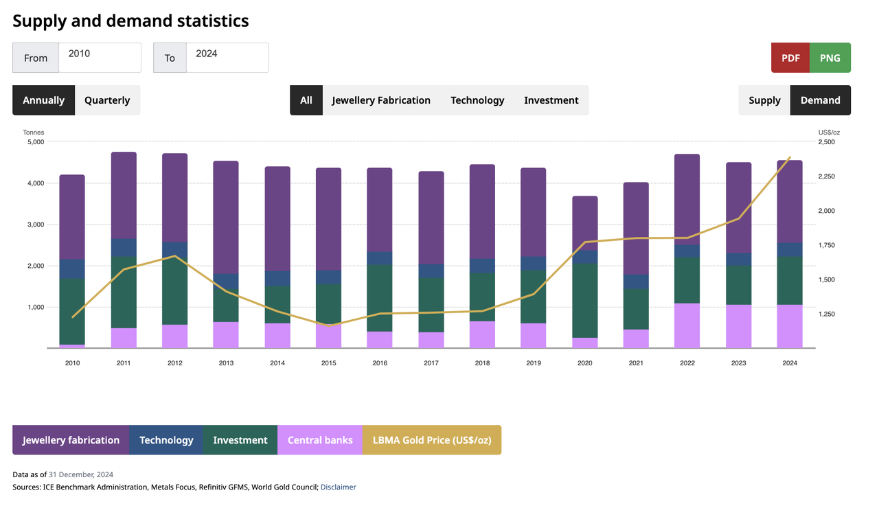 是的,各国央行这三五年对黄金的需求,从每年 500 吨左右已经上升到 1000 吨左右了。央行的需求在黄金需求端的占比从原来 10% 变成 20% 左右。