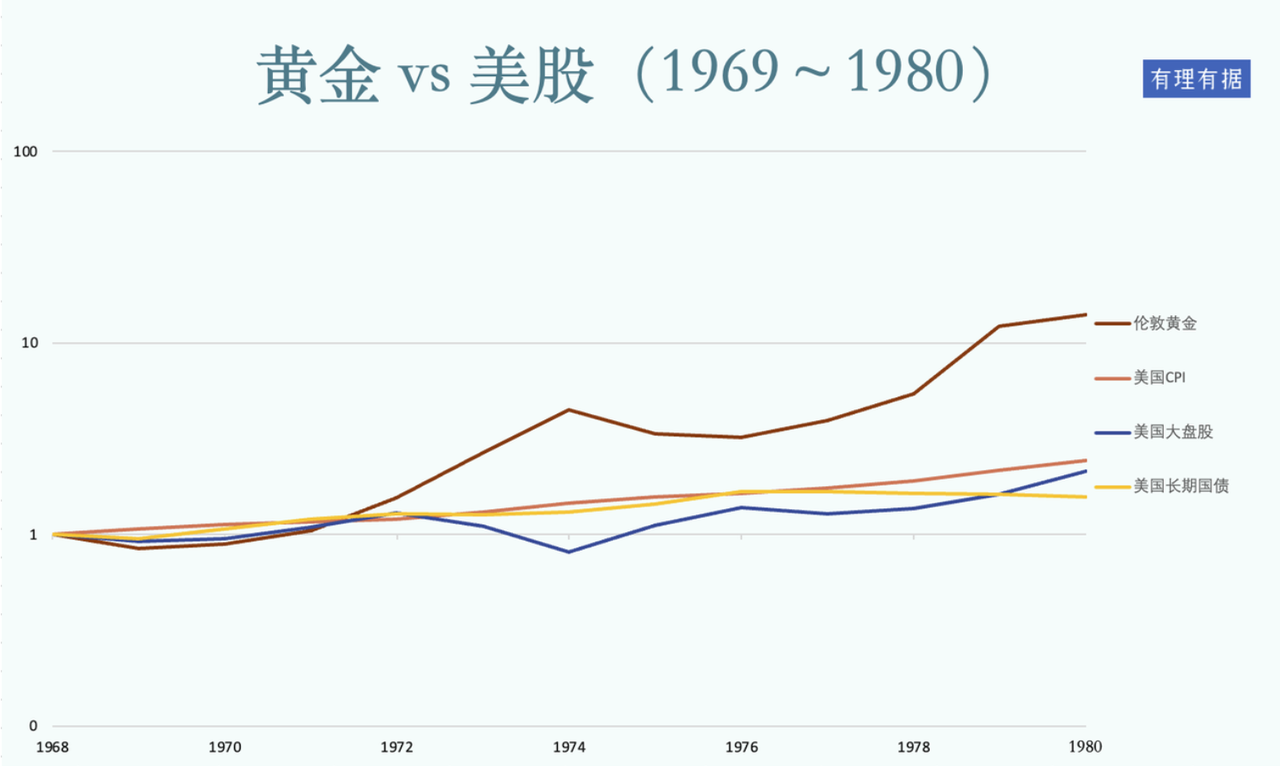 这个有点特殊性,因为从 1944 年到 1971 年,它就像一个大坝一直在蓄水,没有让它贬值,一直还维持着 35 美元/盎司。所以当这个大坝泄洪的时候,一飞冲天, 72 年到 74 年黄金大概就涨了接近 5 倍,所以说这个可能是终其一生才能碰到一次的机会。