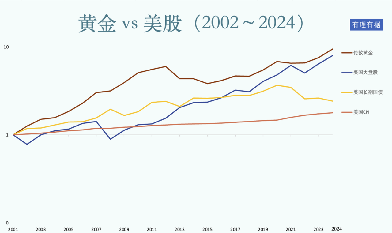 最近这几年历史我们大家都很熟悉了,2016 年特朗普上台,中美贸易战,负利率,黄金价格又往上涨,然后新冠疫情,整个地缘政治等等,这些东西也都是风险。那 2020 年黄金突破了 2074.7 美元 / 盎司,到了 2024 年继续涨,一直到特朗普第二次上台,到最近这几天一度快要突破 3, 000 美元/ 盎司。所以通过看历史这三个区间,那最近的这个区间就是 2002 年到 2024 年,整个黄金的收益率又变成最好的了。