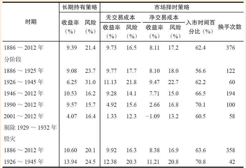 那么西格尔教授这个简单的交易策略效果如何呢?我把书中的图搬运到了这里。从图上你可以看出来,从 1886~2012 年这个横跨一百多年的区间,如果算上通胀的话,传统的长期买入并持有的收益是 9.39%,而我们上面说到的这种策略,如果不计算交易成本,收益反而是更高的 9.73%,如果算上交易成本,结果是稍微低一些的 8.11%。
