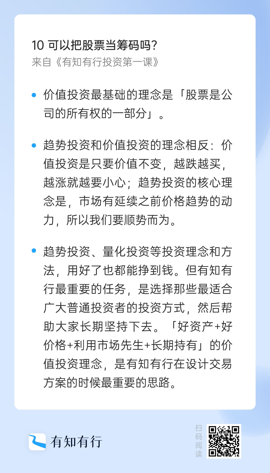 如果用个比喻的话,就是把股票当做「筹码」。其实把股票当成筹码的投资理念,早不稀奇了。市场上总会有一股量级很大的资金,它们并不在意股票背后公司的长期价值,而是看着消息、热点、题材、资金流向等等指标来「炒股」。