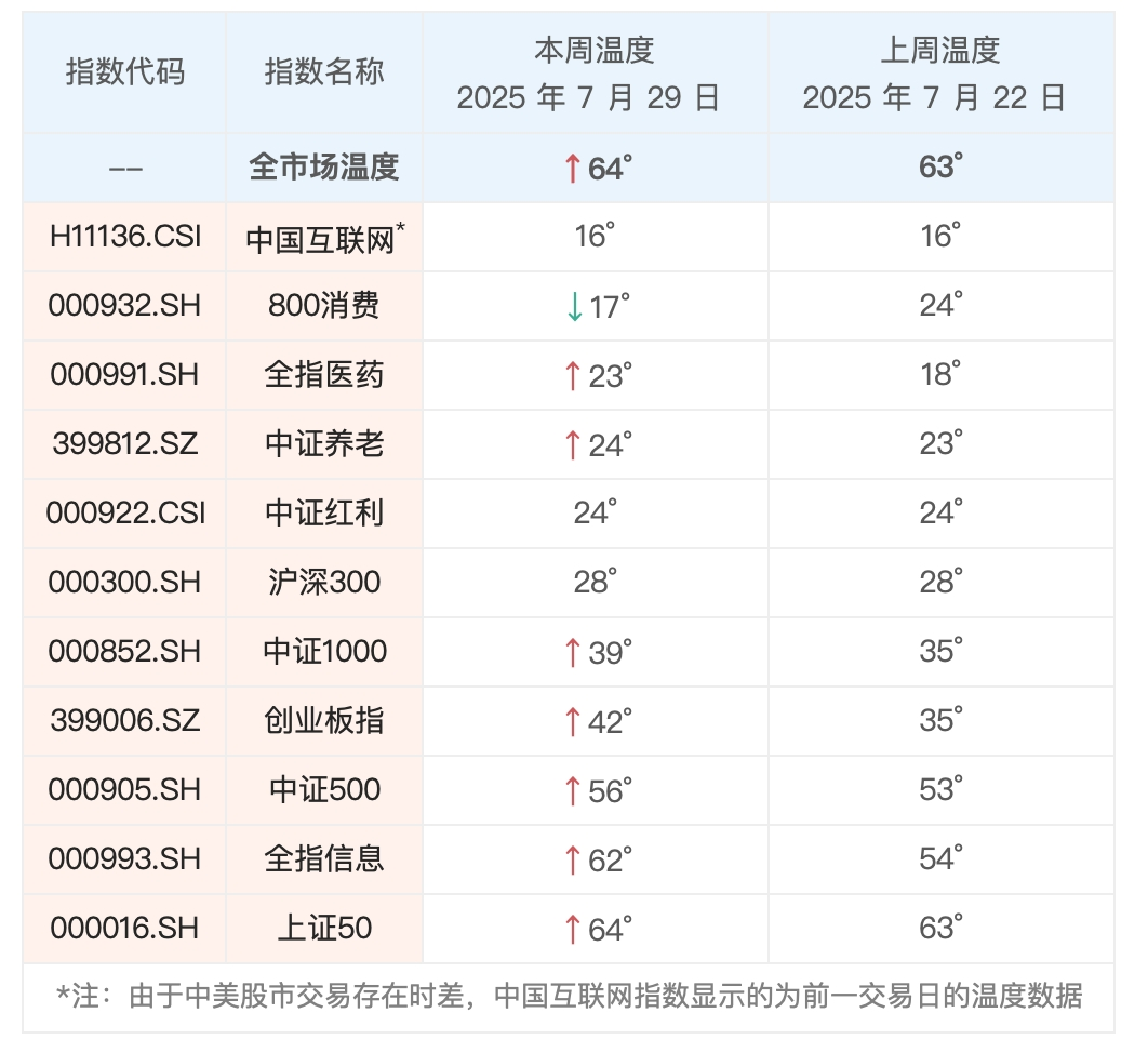 先来看看最近一周的股市表现,从上周三到本周二,A股整体上涨,中证全指上涨 1.43%。最新的全市场温度提高到 64°。具体指数方面,最近一周成长风格指数表现突出,我们关注的指数里,全指医药上涨 5.55%,全指信息上涨 4.76%,创业板指在医药和信息大涨的带动下,上涨 4.14%,表现不错。这三个指数的温度提升得也很快。