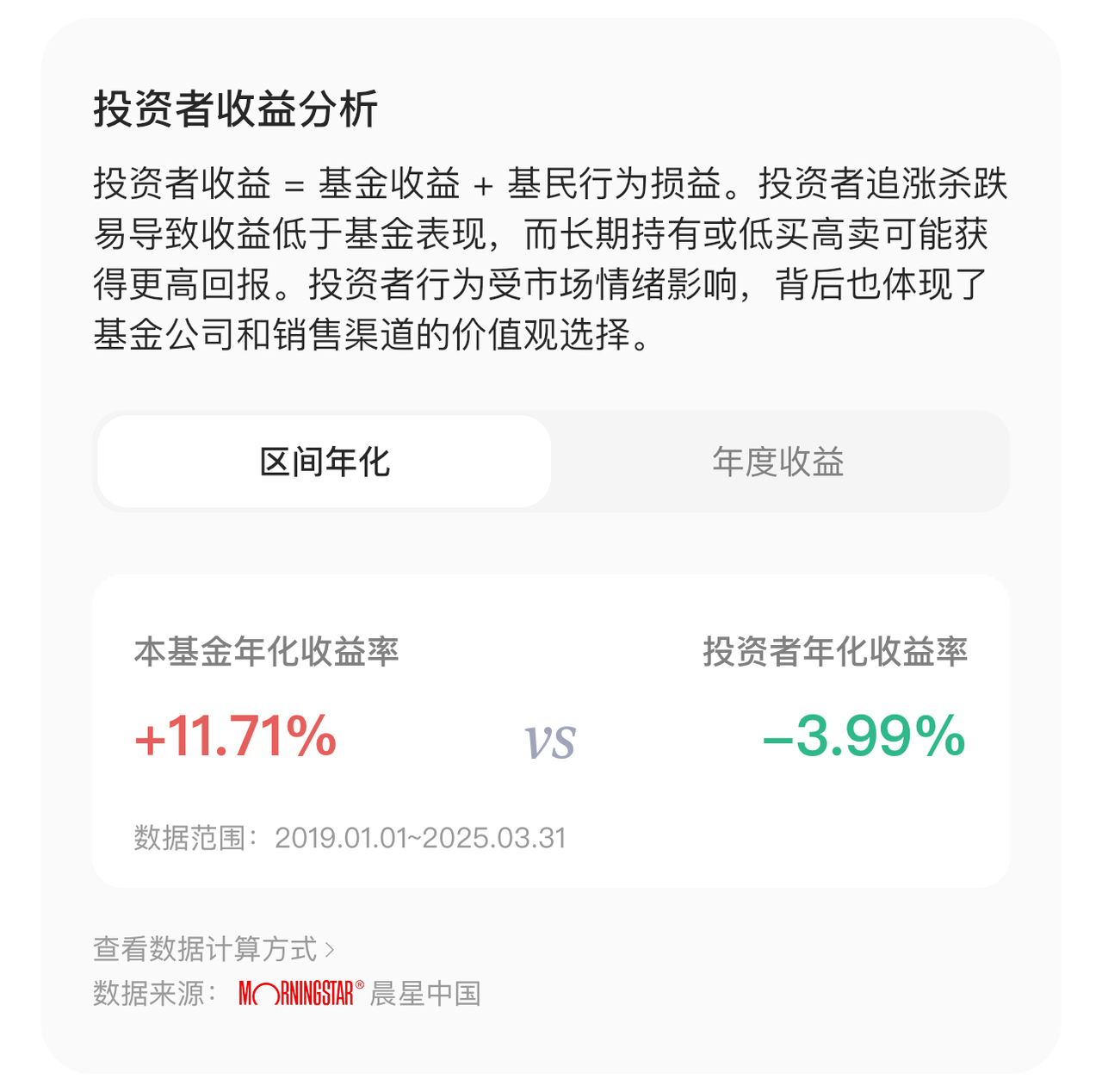 有这种想法是很正常的事情,我们在基金CT功能里,展示了投资者收益与基金收益的对比。我们可以发现在 2020 年、2021 年被大量投资者追涨买入的基金,投资者收益与基金收益的差异很大。尽管基金长期获得了不错的收益,但大量投资者由于买在高点,且经历了之后基金大幅度的下跌,导致投资者收益不佳。大量的投资者都有相似的经历,也意识到投资者追涨杀跌带来的危害。