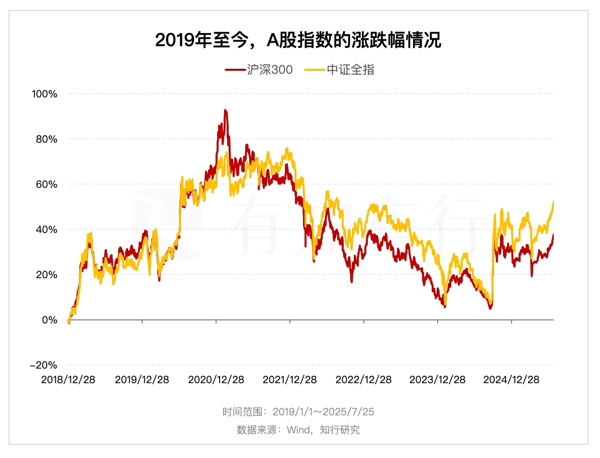 黑板报第 1 期成立于 2020 年 8 月 26 日,当时A股是什么市场情况呢?下面这张图展示了沪深300和中证全指 2019 年年初至今的涨跌幅情况。当时A股经历了 2018 年市场大跌后,2019 年开始出现了一轮上涨行情,到 2020 年下半年开始,市场分化明显。受益于核心资产大涨,大盘股表现优异,大量的中小盘股表现一般。我们从图中能看到,沪深300在 2020 年下半年涨幅明显高于代表市场平均水平的中证全指。