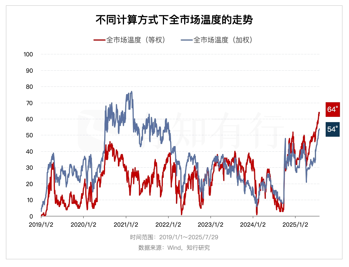除此之外,我们还计算了加权视角下的全市场温度。加权和等权的区别是,大盘股的估值变化对全市场的温度影响更大。因为大盘股的市值高,在全市场温度计算时,赋予的权重就会大一些;而小盘股由于市值低,权重就低一些。
