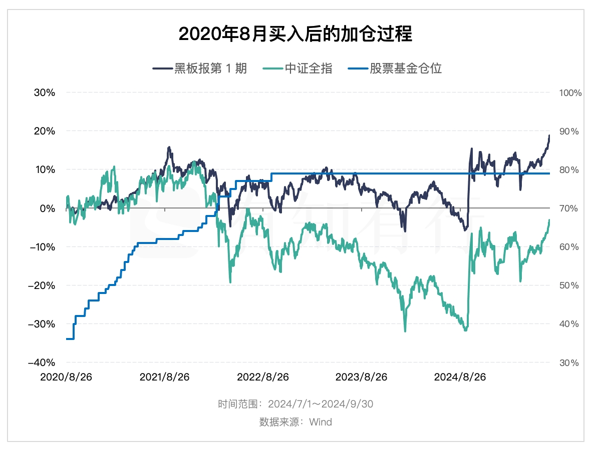 由于股票基金仓位已经很高,黑板报第 1 期之后没有进行过加仓操作,一直保持了八成左右的股票基金仓位至今。我们将黑板报第 1 期的业绩表现以及加仓过程放在了下面两张图中,大家可以参考一下。