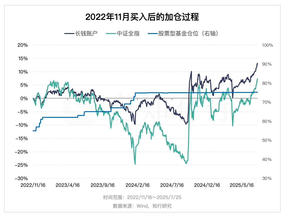 我们拿 2022 年 11 月长钱账户上线后的表现来举例。经历了 2022 年 10 月市场低点后,市场沉浸在疫情放开的利好刺激中,出现了一轮反弹,长钱账户降低了新钱买入时的股票基金配置比例。之后随着市场下跌,尤其是 2023 年 10 月到 2024 年年初的快速下跌中,长钱账户快速加仓,将仓位再次加到了七成以上。我们能看到,整个过程中,长钱账户的波动要小很多,市场涨起来也容易创出新高。