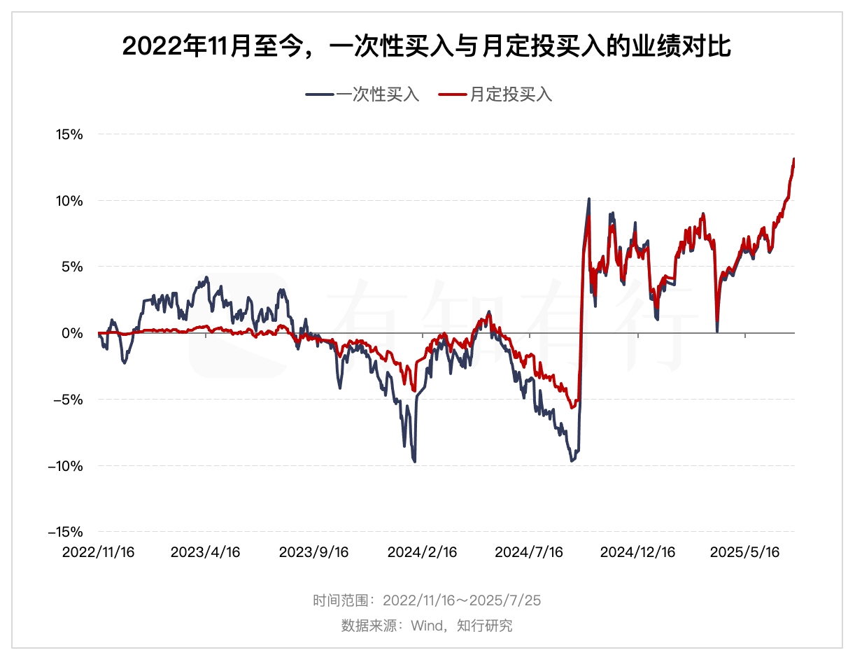 我们回测了 2020 年 8 月至今以及 2022 年 11 月至今,一次性买入以及月定投买入两种模式的收益率对比。在总投资金额一样的情况下,月定投的累计收益率波动会更小一些,尤其是早期会更明显。早期投入金额在总投资金额中的占比很小,市场涨跌对账户收益影响很小。随着累计投入金额越多,新增投入金额对总投入金额的影响会降低。