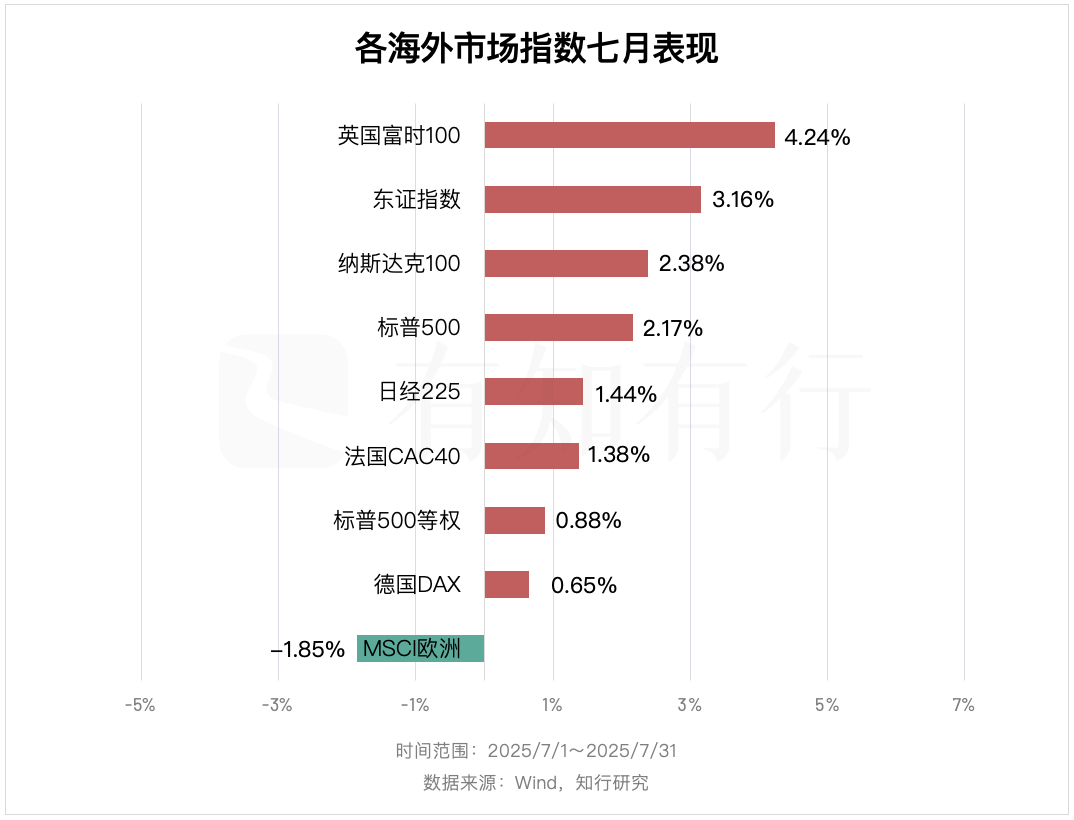 七月的海外股市整体来说是上涨的。英国富时100指数上涨了 4.24%,日本东证指数上涨了 3.16%,美国纳斯达克指数和标普500指数的涨幅都在 2% 以上。唯一下跌的是 MSCI 欧洲指数,跌幅为 -1.85%。