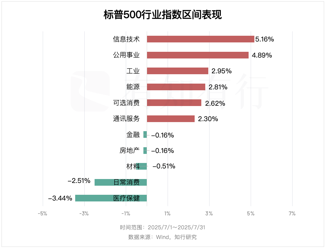 可能会有朋友疑惑,为何英法德三国股指上涨,MSCI 欧洲指数却是下跌的?这是因为七月欧洲主要是军工、金融和能源类大公司上涨,而医疗保健、消费、科技类的公司多数是下跌的。在 上个月的月报 中我们介绍过,英国富时100、德国DAX和法国CAC40指数是蓝筹股指数,成分股少,权重集中于各国的大公司。七月,军工、金融和能源类大公司的上涨,推动了整体指数的上涨。